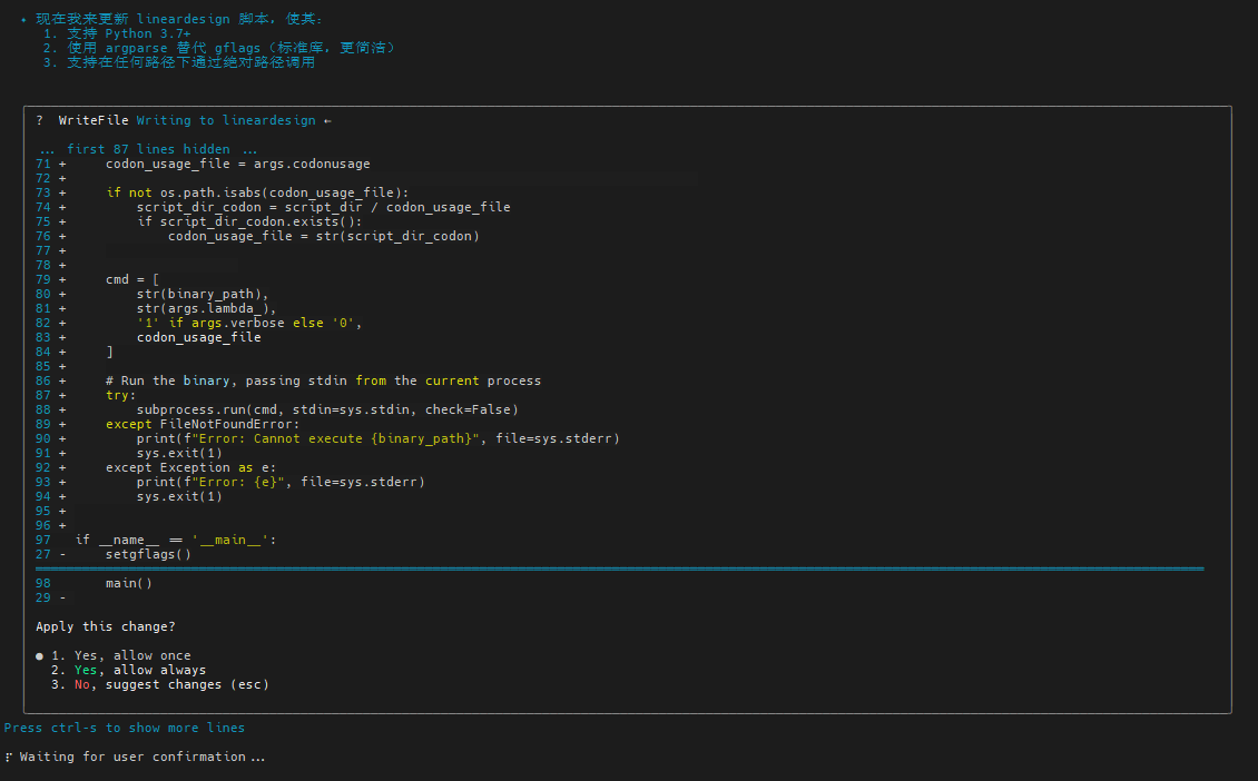 虽然 Gemini CLI 能力更强(如联网搜索、长上下文),但 Qwen Code 在本地文件操作、代码生成方面更成熟,而且主打国产自主、每天 2000 次免费额度,适合中文社区和阿里生态。因此,我们在这里选择使用 Qwen Code CLI 对 LinearDesign 上面提到的两个尝试进行 AI 优化修复。