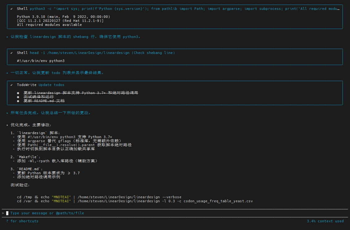 LinearDesign源码根目录,打开qwen,输入需求。优化 LinearDesign 项目,要求可以在任何路径下通过绝对路径调用编译好的 lineardesign 进行mRNA序列优化,要求支持 python >= 3.7 语法